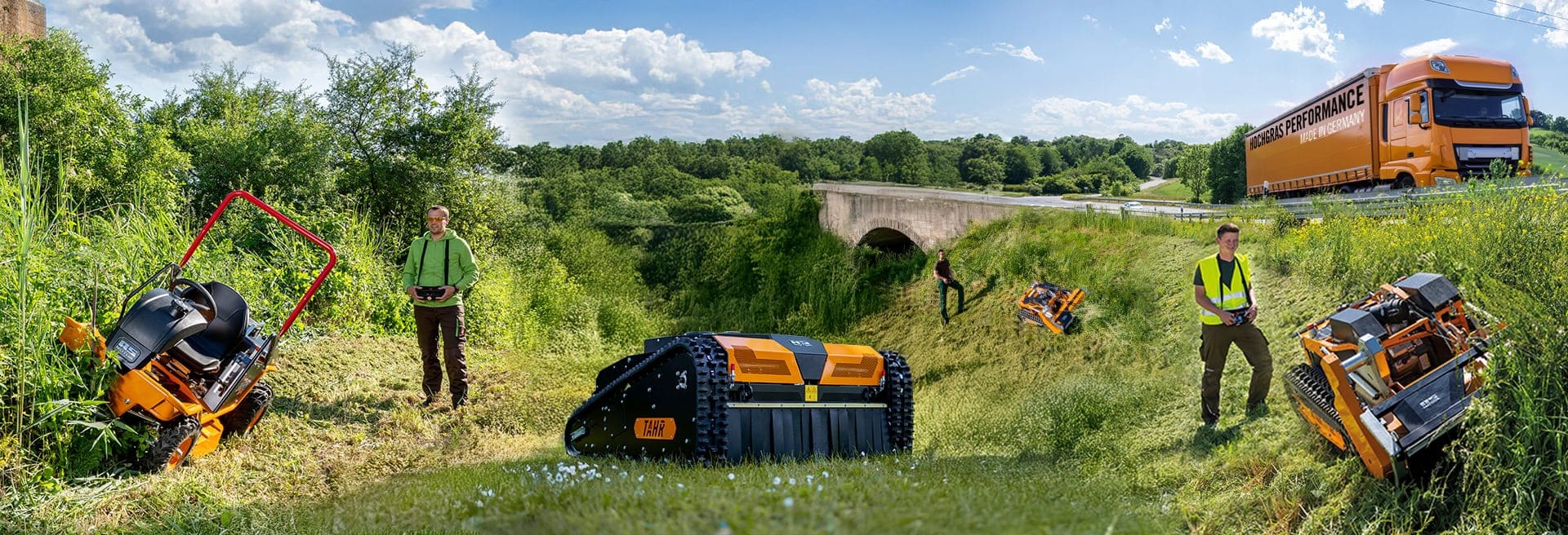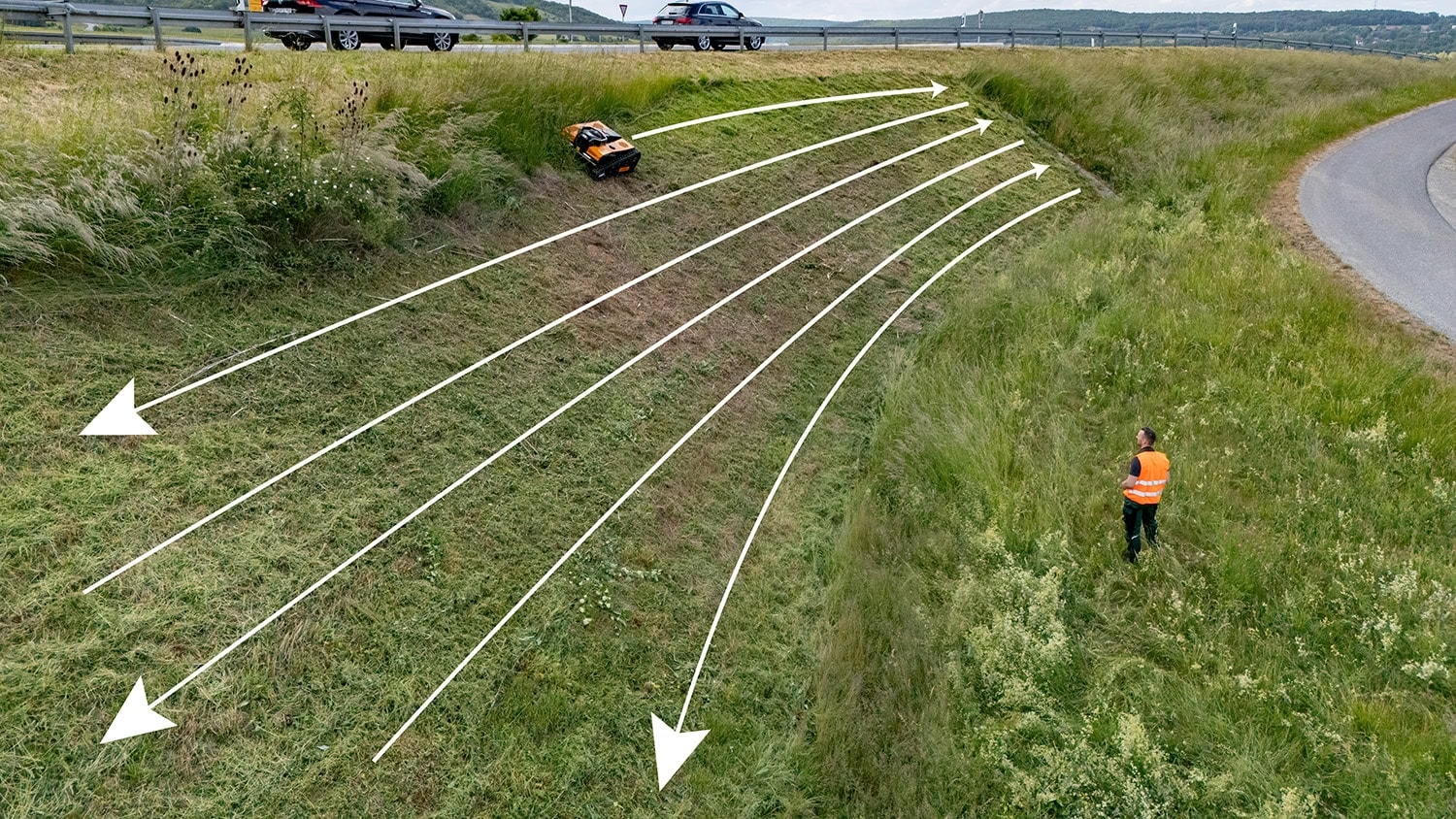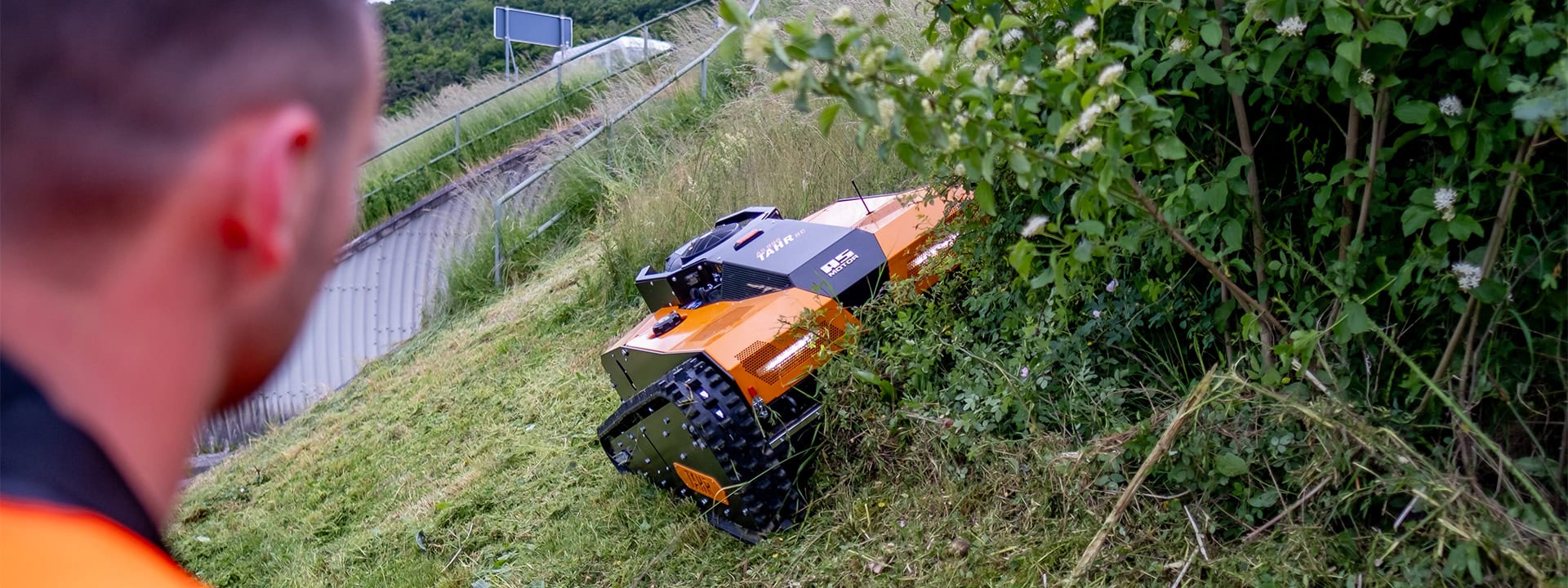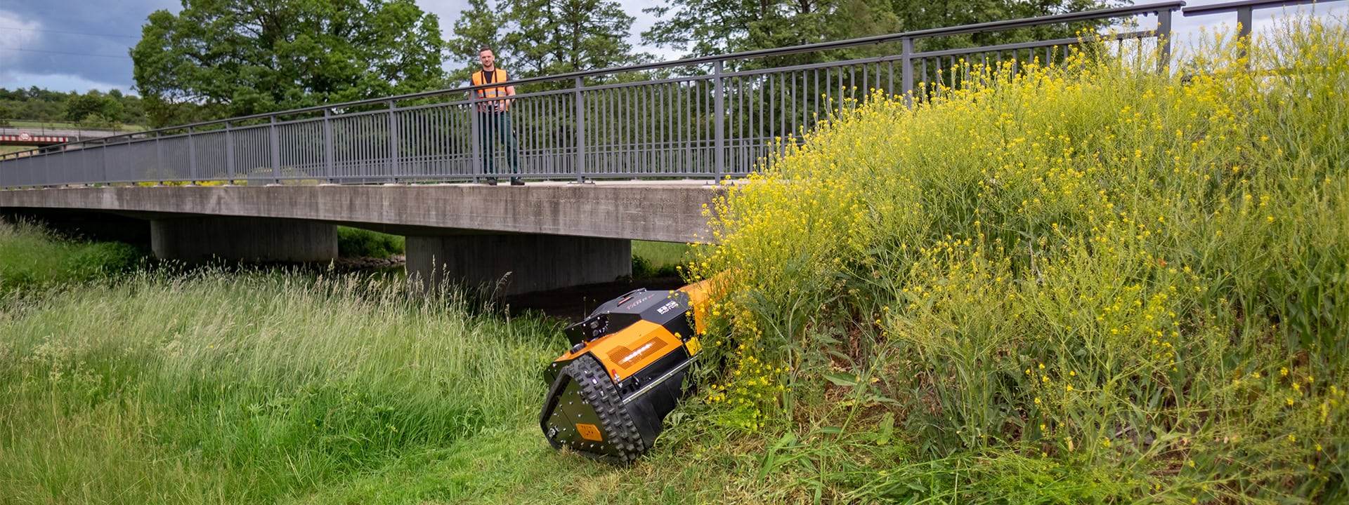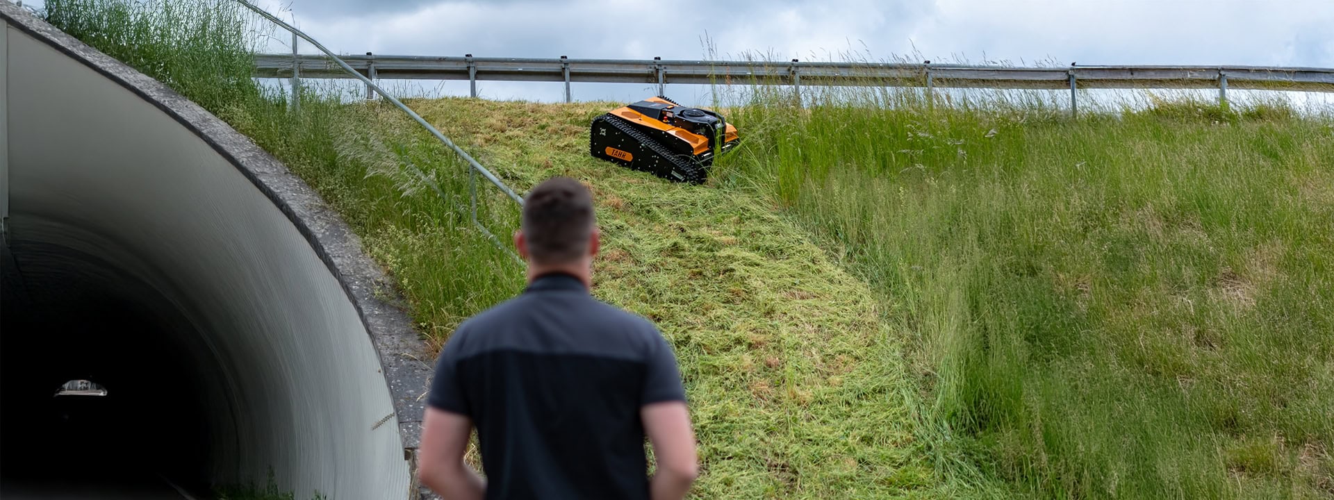 Thanks to its compact crawler chassis and the ability to mow forwards and backwards, the Tahr RC can fully maintain linear slopes on bridges, ramps and underpasses without risky turning maneuvers near structures or drop edges. The operator always remains at a safe distance above or to the side of the area.